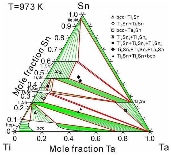 Calculated isothermal section of the Ti-Ta-Sn ternary system at 973 K, compared with experimental data [16].