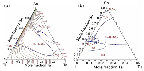On the basis of the presently obtained thermodynamic description of the Ti-Ta-Sn system, the liquidus projection appended with isothermal lines is shown in Figure 4. Figure 4b presents an enlarged region in order to display the complicate reactions near the Ti-Sn boundary, 0 to 5 at.% Ta. The invariant reactions on the liquidus surface are listed in Table 4. As can be seen in Figure 4, for a Ti-Sn alloy, the bcc primary phase region can be significantly enlarged from 16 at.% Sn up to a maximum 30 at.% Sn by doping about 1.5 at.% Ta. Further increasing the content of Ta, the bcc primary phase region shrinks gradually. When doping a large amount of Ta and Sn in Ti-based alloys, Ti36Ta28Sn36 may precipitate as the primary phase instead of bcc phase, which would strongly influence the properties of Ti-based alloys.