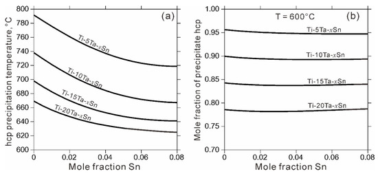 Commonly, Ti based alloys undergo aging treatment after cooling in order to precipitate α_hcp-Ti phase in β_bcc-(Ti,Ta), which is an effective way to improve the mechanical properties. Consequently, it is interesting and technically important to know when the transformation from β_bcc-(Ti,Ta) to α_hcp-Ti takes place and how the alloying element influences the transformation. Figure 5 shows the influence of Ta and Sn content on the precipitation temperature and amount of α_hcp-Ti phase in β_bcc-(Ti,Ta) phase. According to the calculations, it is obvious that increasing the contents of Ta and Sn, especially Ta content, can significantly decrease the transformation temperature. Besides, when aging at 600 °C, the increase in Ta content may reduce the amount of α_hcp-Ti precipitates, while the influence of Sn content is negligible. Thus, prior to experiment, the alloying composition and aging heat treatment schedule can be designed and optimized based on thermodynamic calculations to further obtain optimal properties.