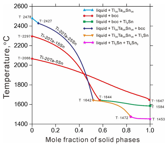 Recently, Ti-based alloys mainly with the contents of Ta and Sn between 10 and 30 at.% have attracted more and more attentions due to their favorable properties [3,7,28]. Based on the presently obtained thermodynamic description of the Ti-Ta-Sn system, the Scheil solidification simulations of Ti-20Ta-xSn (x = 5, 15 and 25) as-cast alloys were performed, as shown in Figure 6. The Scheil solidification curves can provide various information like primary phase, transformation temperature, solidification path and so on. For a Ti-20Ta alloy, when the content of alloying element Sn is less than 25 at.%, the primary phase would be β_bcc-(Ti,Ta) phase. While increasing Sn content up to 25 at.%, the primary phase changes to be Ti36Ta28Sn36. Moreover, large Sn content (exceeding 15 at.%) leads to the formation of Ti3Sn and Ti6Sn5. As can be seen, performing Scheil solidification simulations based on the presently obtained thermodynamic description of the Ti-Ta-Sn system can predict the primary phase and solidified phased in the as-cast alloys, which may affect the subsequent microstructure and properties.