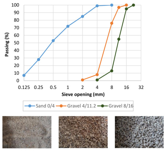 The cement used was CEM I 52.5 N CE CP2 NF Gaurain (CCB, Gaurain, Belgium). The cement’s Blain specific surface area was 4400 cm2/g, and its density was 3.19 g/cm3. The chemical composition of the cement is given in Table 1. The fine aggregate used was predominantly siliceous (72% of SiO2 and 13% of CaCO3) sand of 0–4 mm fraction, with a density of 2580 kg/m3 and water absorption equal to 0.77%. The coarse aggregate used was a combination of siliceous-calcareous gravel of a 4–11 fraction (R GSM LGP1) and 8–16 fraction (R Balloy). The 4–11 and 8–16 fractions density were 2530 kg/m3 and 2580 kg/m3 and water absorption were equal to 2.61% and 2.25%, respectively. The Los Angeles abrasion coefficient of the gravel fractions was less than 30. The grain size distribution and appearance of the fractions are given in Figure 1. As an admixture, the superplasticizer SIKAPLAST Techno 80 (SP) was used to obtain adequate workability of CBM mixtures.