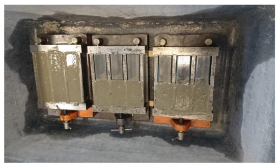 An example of a set of moulds filled with cement paste (MCP) mixture for testing at a single age.