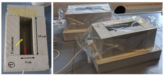 Specimens for measuring temperature and electrical conductivity of mixtures were cast into the custom-made extruded polystyrene container, and the upper surface was covered with a polyvinyl sheet to avoid water evaporation, as shown in Figure 3. Inside dimensions of the container were 5 × 10 × 15 cm3, to ensure complete immersion of the sensors into the mixture. For each of the three mixtures, 2 parallel test specimens were prepared.