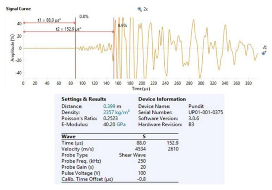 For measuring the transmission time of longitudinal ultrasonic waves (P-waves) and ultrasonic shear waves (S-waves), the Proceq Pundit PL-200 device (Figure 4) (Proceq, Schwerzenbach, Switzerland) was used, with an operating frequency range of 20 kHz to 500 kHz. This range of frequencies is appropriate for the research of building materials [4]. With the ultrasonic method, the dynamic elastic modulus (Ed), the dynamic Poisson’s ratio (νd) and dynamic shear modulus (Gd) were determined (Figure 5). Measurements were made on the MCP and MOM specimens with 40 × 40 × 160 mm3 dimensions and on MOC specimens with 100 × 100 × 400 mm3, using the shear waves probes with a frequency of 250 kHz. Tests were carried out before standard testing on specimens aged 30, 36, 48, 72 h and 7 days.