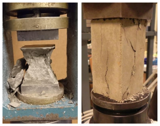 The compressive strength fc for MCP and MOM specimens was assessed following the standard EN 1015-11 [48], on the halves of 40 × 40 × 160 mm3 prism, after the flexural test. For determination of nominal compressive stress, needed for cyclic loading/unloading protocol to determine the modulus of elasticity, the prism specimens of dimensions 40 × 40 × 80 mm3 were used. An example of compressive tests performed is shown in Figure 6. The compressive strength of the MOC was determined by following the standard EN 12390-3 [49], on the 150 mm cube and 100/200 mm cylinder.
