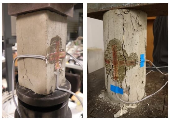 An example of a prism specimen of MCP/ mortar (MOM) (left) and cylinder specimen of concrete (MOC) (right) after the modulus of elasticity, Poisson’s ratio and σ-ε test.