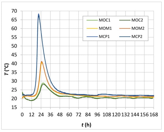 The time-dependent temperatures of two MCP, two MOM and two MOC specimens within the seven-day measuring period are shown in Figure 8.