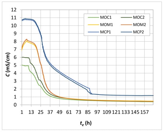 Time-dependent conductivity (C−te) for MCP, MOM, and MOC specimens.