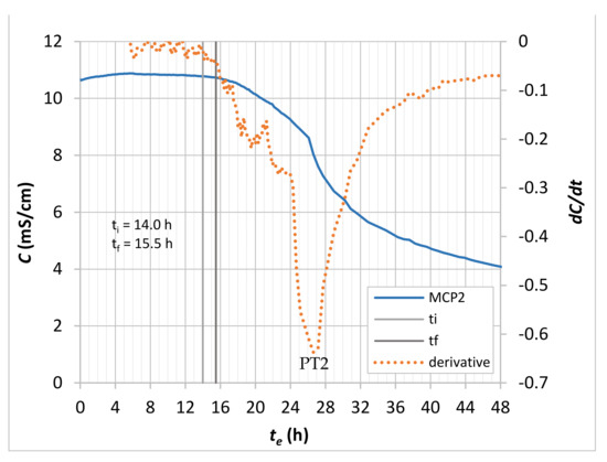 During the structure formation process of the CBM, several stages (initial and final setting time, percolation of solid phases, de-percolation of water-saturated pores and the time of the most intensive solidification process) are usually defined based on typical ultrasonic velocity time-dependent profiles [2]. Vogrič et al. showed [8] that a high degree of correlation exists between the P-waves ultrasonic velocity-time (VP−t) and electrical conductivity-time curves. By considering this correlation, the initial setting time (ti), final setting time (tf) and end of the solidification process acceleration stage (inflexion point PT2) were determined for MCP and MOM specimens (Table 5), using the electrical conductivity-time curve (C−t) and the rate at which conductivity changes (dC–t curve). Figure 10 illustrates how these parameters were determined for the MCP2 sample. The C-t curves were not smooth enough for MOC specimens to determine all the parameters, probably due to much lower cement paste content and coarse aggregate grains. This is in line with findings related to the VP−t curves where an increase in the aggregate content leads to less visible substages of the rapid VP increase period [2]. Therefore, only the initial setting was determined for the MOC specimens, as the time at the rapid drop of the dC-t curve. The final setting time was calculated considering the same setting periods of the MOM and MOC—which were equal to 90 min.