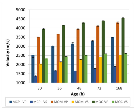 MOM specimens contain a larger number of solid fractions due to the incorporation of sand. Thus, higher values of the VP and VS were measured for these specimens (Figure 11). The VP/VS ratio is close to 1.71 for all but 48 h, where the ratio is increased to 1.73. This increase may also be due to crack formation, although the extent of the cracks seems to be much lower due to a smaller volume of cement paste and higher volume stability of the MOM compared to the MCP.