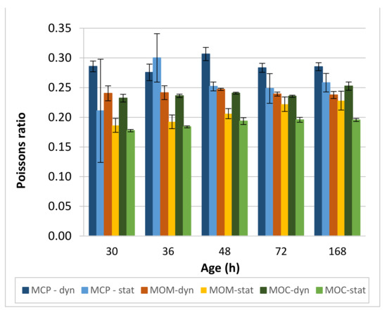 - Comparison of dynamic and static Poisson’s ratio, νd and νs, revealed that the value is approximately 0.285 for νd and about 0.25 for νs when MCP is considered. The νd value between 0.24 and 0.25 was obtained for the MOM and MOC. Static Poisson’s ratio gradually increased with the specimen’s age. Values from 0.19 to 0.23 were obtained for the MOM, and from 0.18 to 0.20 for the MOC.