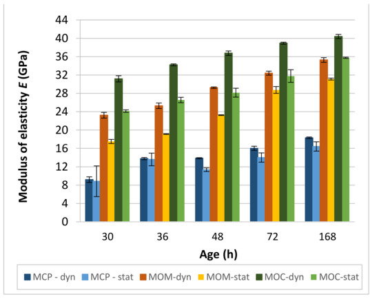 The difference between static and dynamic Poisson’s ratio for studied CBMs is presented in Figure 12. For the MCP, νd is close to 0.285 for 30, 72, and 168 h. Lower (0.276) and higher (0.307) values were measured at 36 and 48 h, respectively. Values of νd below 0.30 are expected for the hydrated cement paste (HCP) since Poisson’s ratio of cement clinker minerals is 0.3 [62] and that of C-S-H outer and inner gel and of Ca(OH)2 is 0.25, 0.25, and 0.30, respectively [63]. The effect of formed cracks on the VP and VS values directly influenced calculated νd at these two ages. The static Poisson’s ratio νs is, as a rule, lower than the νd and is around 0.25 at the age of the MCP 48 h or higher. On the other hand, at 30 and 36 h, the test results’ standard deviation was so high that the measured average value could not be applied as a realistic parameter. The presence of autogenous shrinkage cracks can be responsible for the observed behaviour. For MOM prisms, νd is mostly in the range of 0.240 ± 0.002, except for the 0.247 ± 0.002 value at 48 h. Again, the presence of cracks in the specimens could influence the observed exception from the rule. The static Poisson’s ratios νs of the MOM gradually increase, from 0.186 at 30 h to 0.228 at 168 h. A gradual increase of dynamic and static Poisson’s ratios with the specimen’s age was also observed for the MOC composition, where νd increased from 0.232 at 30 h to 0.252 at 168 h, and νs increased from 0.178 at 30 h to 0.196 at 168 h.