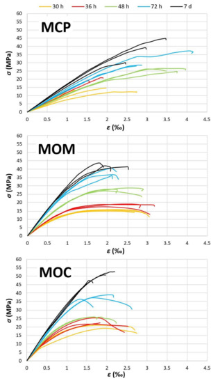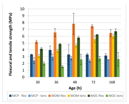 Flexural and splitting tensile strengths of the tested MCP, MOM and MOC mixtures are shown in Figure 16. Direct comparison is possible between the MCP and MOM compositions due to the identical prismatic specimens used. Tensile strength tests are much more sensitive to the presence of cracks compared to the compression test. For the MCP composition, tensile strength does not follow the compressive strength increase with the increase of the specimen’s age. Average values of flexural strength are between 3.14 MPa (168 h) and 3.96 MPa (36 h), and those of the splitting strength are between 2.40 MPa (30 h) and 2.94 MPa (36 h). Additionally, a high variation of the test results at 36 h and 48 h was observed. Observed behaviour is typical for specimens with induced cracks or other defects. Much higher flexural and splitting tensile strengths were obtained for the MOM specimens due to the incorporation of the fine aggregate. Average splitting strength values are gradually increasing with the specimens’ age, from 3.10 MPa (30 h) to 5.98 MPa (168 h). The situation is different for flexural strength, where the highest average value (7.81 MPa) and, at the same time, high standard deviation (1.55 MPa) were obtained at 48 h. Moreover, flexural strength at 168 h was lower compared to that at 72 h. From these results, one can conclude that the presence of cracks in MOM specimens is reflected in the change of flexural strength with the age of the specimen. For the MOC composition, flexural strength gradually increases with the specimens’ age, from 4.14 MPa at 30 h to 6.70 MPa at 168 h. The situation is different for the splitting strength, where the decrease of strength was observed from 30 h to 36 h (from average value 1.99 MPa to 1.52 MPa) and approximately the same average strength of 2.65 ± 0.07 MPa was maintained from 48 h to 168 h.