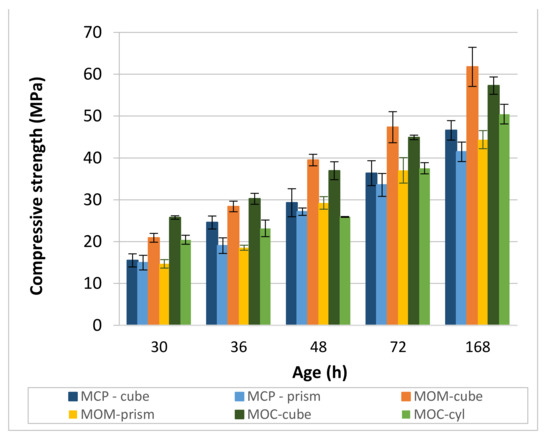 Comparing the MOC compressive strength to that obtained for the MOM composition is possible only if the shape conversion factor 1.12 is used to calculate the equivalent compressive strength of the 40 mm cube from the 150 mm cube. The comparison reveals that the MOC’s compressive strength is higher only for the 30 h and 36 h. At later ages, however, the compressive strengths of the two compositions are about the same. The standard cube (150 mm) compressive strength of the MOC reported in [55] is 30 MPa and 51 MPa for 48 h and 168 h, respectively. These values are slightly lower than 35 ± 2 MPa and 54 ± 2 MPa, respectively, obtained in our study.