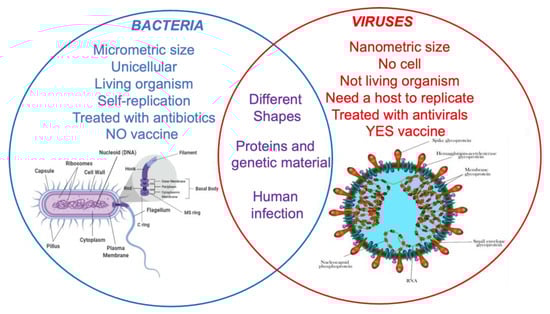 Viruses and bacteria are microorganisms that exploit all the environments where different life forms are present. The main differences concern morphology, size, and replication capacity (Figure 1 [45]). Bacteria are unicellular microorganisms called prokaryotes that can grow in very different environments, including harsh conditions such as acidic hot springs and radioactive waste, where they form dense aggregations on surfaces called biofilms. They are autonomous for reproduction, and they can be grown on synthetic soils. The bacterial cell is a complex structure, with an inner cell membrane and an outer cell wall, which ranks the bacteria into Gram-positive and Gram-negative that can have an enclosing capsule of polysaccharides for extra protection. The membrane coats a cytoplasm containing nutrients, proteins, DNA, and other essential components of the cell. A single, circular chromosome which carries the bacterium’s genetic information is found in the nucleoid together with ribosomes for protein synthesis. The cell can be coated by a rigid bacterial wall that confers a particular morphology. For this reason, bacteria with a spherical shape are called “Cocci” (i.e., Staphylococcus, enterococcus) and the ones with a rod shape are called “Bacilli” (i.e., Anthrax bacillus). The Gram-positive bacteria present an external membrane composed of peptidoglycans, while Gram-negative bacteria have an additional one, consisting of lipopolysaccharides and proteins, that covers them. On the outside, the bacterial cell can be surrounded by a capsule and equipped with appendages such as flagella, responsible for the cell movement, or pili which allow for the adhesion to host surfaces and/or tissues. As regards size, bacteria can be observed under a simple optical (light) microscope, having micrometer or sub-micrometer sized structures.
