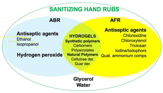 Sanitizing hand rubs can be classified as alcohol-based rubs (ABR) or alcohol-free rubs (AFR) according to the active antiseptic agents used. Both types share the same basic ingredients—water and glycerol—and, in the case of hydrogel preparations, also thickening agents (Figure 2). Hydrogel sanitizing hand rubs can be formulated from natural, semi-, or synthetic polymeric materials which allow an increased product performance at the hands’ skin level, carrying out a more prolonged antimicrobial activity. These gelled forms, when compared to liquid ones, ensure greater permanence on site due to their gelling properties, provide rheological control in thickening, and present a non-tacky feel, allowing the exploitation of their physical properties in performing personal care products.
