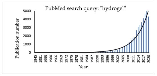 Hydrogels are three-dimensional, hydrophilic cross-linked polymeric networks extensively swollen with water (or biological fluids) [74]. Several parameters, such as the cross-linking degree of the polymer and its hydrophilicity [75,76,77], can significantly affect their properties. Hydrophilic polymers show the ability to swell in water and to hold more than 10% water within the gel’s network. This property depends on the presence of different functional groups on the polymeric chain, such as carboxylic (-COOH), hydroxylic (-OH), amidic (-CONH), and sulphonic (-SO3H) ones [78]. Hydrogel texture can be influenced by modifications in the structure and functionality of the polymer, in changes of its concentration and in the use of different cross-linkers. Moreover, new hydrogels have been studied and realized in different fields of engineering (environmental, biomedical), biotechnology, and many other contexts [79]. The growing interest in the topic can be easily checked by a quick search for the term “hydrogel” in the PubMed database that shows a significant exponential trend in the number of published papers regarding this item (Figure 3).