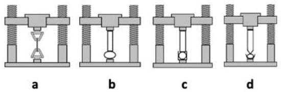 The compression tests are carried out in an unconfined model (b) or confined one (c and d). In the first model (b), two plates compress the hydrogel, which is placed between the two punches. In the second test (confined compression, c), the hydrogel is confined inside a sample holder and compressed by an upper punch. In the indentation testing (d), the hydrogels are serrated by a probe, of defined shape, that penetrates the thickness for a given depression, then measuring the specific force needed to lead to this indentation [96].