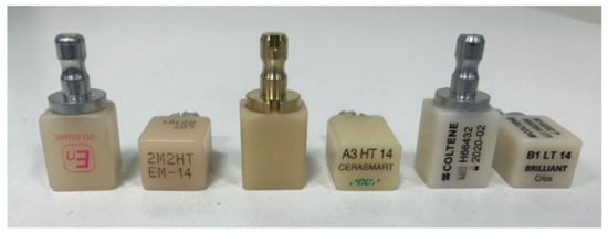 Examples of commercial CAD/CAM blocks. From the left: resin matrix composite Vita Enamic, resin matrix composite CERASMART and composite Brilliant Crios, reprinted with permission from ref. [44] (Copyright 2020 Inżynier i Fizyk Medyczny).