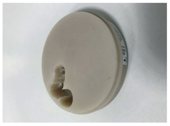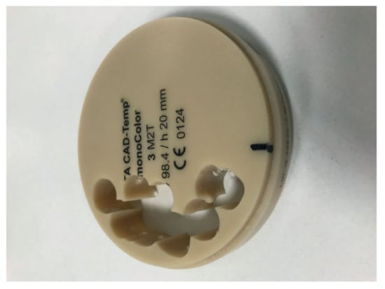 A study on the resistance of resin composite crowns was performed using the example of the maxillary first molar, and lithium disilicate glass ceramic (IPS e.max CAD by Ivoclar vivadent) was utilized as a control reference [79]. In the same work, an evaluation of fracture strength and biaxial flexural strength showed satisfactory results. All CAD/CAM composite blocks that were tested (among them Shofu block HC by Shofu Inc., KZR-CAD HR by Yamamoto precious metal Co. and Katana avencia by Kuraray noritake dental) exhibited about 3–4 times higher fracture strength than the average maximum bite force of the molar tooth (700–900 N). An example of a composite CAD/CAM disk is presented in Figure 6 (below).