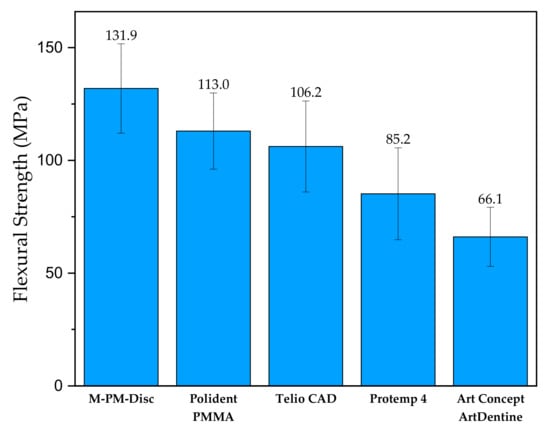 Flexural strength of different commercial interim PMMA-based resins. Adapted from ref. [68].
