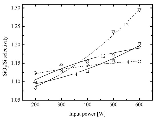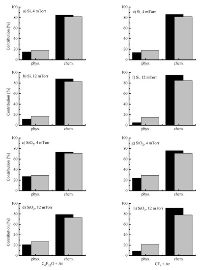 - Similar changes of etching rate for each material in C6F12O- and CF4-based plasmas vs. input power and gas pressure may be attributed to similar etching regimes. In general, this may be either the polymer-thickness-controlled etching process (through the transport of etchant species to the film/etched surface interface) or the chemical reaction itself under the condition of thin or even non-continuous polymer film. In our case, the second variant looks more favorable because of the low polymerizing ability of CF4 plasma [3,4,5,7,8,17] as well as the similar feature of the C6F12O + Ar gas system. As follows from Figure 3a–d, the latter exhibits the only small increase in the amount of carbon-containing compounds on both Si and SiO2 surfaces. In addition, one can see that both gas systems provide the lower amount of fluorocarbon polymer on SiO2 compared with that on Si. This well-known effect is due to the etching of polymer by O atoms on the film/SiO2 interface [5,6,7,8].