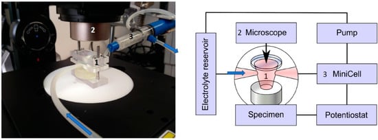 For the electrochemical measurements and concurrent microscopic observation of the corroding surfaces, an opto-electrochemical cell was designed and constructed from Plexiglas (Evonik Röhm GmbH, Darmstadt, Germany). The miniaturized, electrochemical cell consisted of a chamber with a height of 7 mm and a contact area of about 0.8 mm2 to the bare surface of the specimen. Furthermore, the chamber had two electrolyte ducts, one of which connected to an electrolyte reservoir for filling the cell with electrolyte at the beginning of the experiment and the other connected to the Mini-Cell System (MCS) (Figure 2). The Mini-Cell System [45] contained the platinum counter electrode (CE) and the saturated calomel reference electrode (SCE, E0 = 0.241 V).