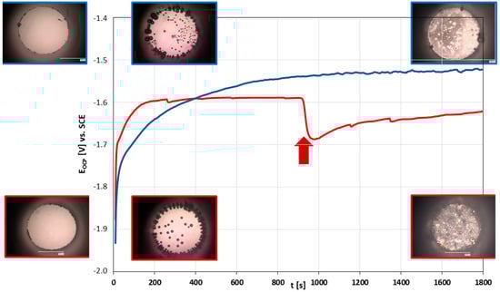 EOCP vs. t plots for XHP (red) and cp (blue) magnesium aligned with microscopic pictures (prior to contact with electrolyte, as well as at t = 0 and 30 min, after removal of the hydrogen bubbles); arrow: spontaneous detachment of large hydrogen bubble exposing fresh magnesium surface.