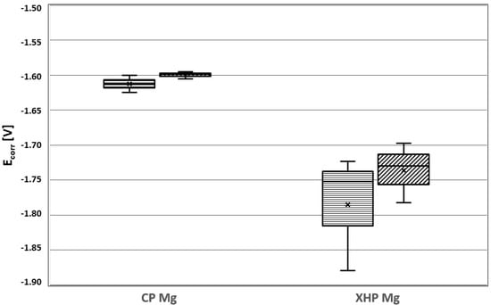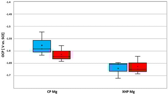 EOCP after 30 min of XHP and cp magnesium in MEM at stationary and dynamic electrolyte flow conditions, at 25 °C. Left box relates to stationary and the right box to dynamic conditions.