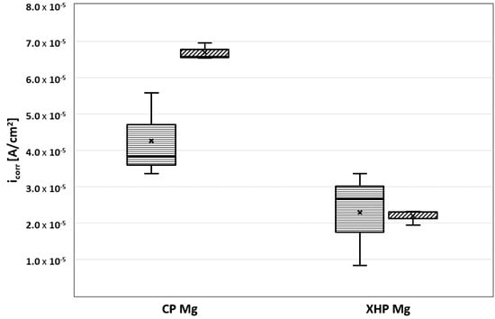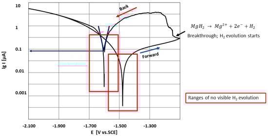 The subsequent cyclic voltammetry disturbed these equilibriums and produced new data for the interpretation of the degradation XHP and cp Mg. The higher cathodic currents in the case of cp Mg revealed the higher catalytic activity of cp Mg in comparison to XHP Mg, as described by Birbilis et al. [53]. In the voltammetric forward scan, the MgH2 creation in direct contact with Mg(OH)2 was seen resulting in an anodic shift of Ecorr of the forward scan. There were significant differences between XHP Mg and cp Mg, which were seen in the more anodic shift of Ecorr forward, in the higher icorr values, and its reproducibility. This demonstrated the higher activity, which was possibly caused by the impurities in cp Mg. An explanation for the scattering of the CVs of XHP Mg cannot be given at the moment, but the observations described in [55] are supported.