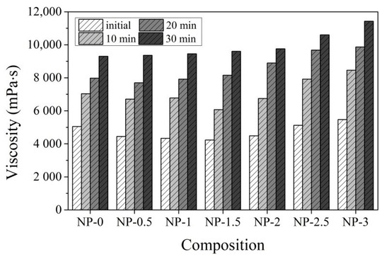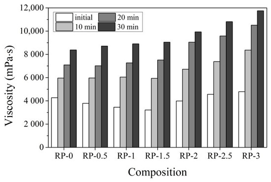 Immediately after paste preparation, the viscosity of control CEM IIR and CEM IIN pastes differed significantly. CEM IIR paste viscosity is 14.7% lower than the CEM IIN paste viscosity (Figure 1 and Figure 2). This difference is partly due to the higher w/c in the CEM IIR paste. Another reason is that CEM IIN contains significantly more minerals C3A and C3S, which are immediately involved in the hydration process and increase the viscosity of the paste [42]. A similar difference persists after 30 min of measurements.