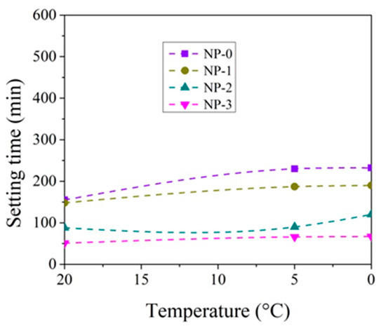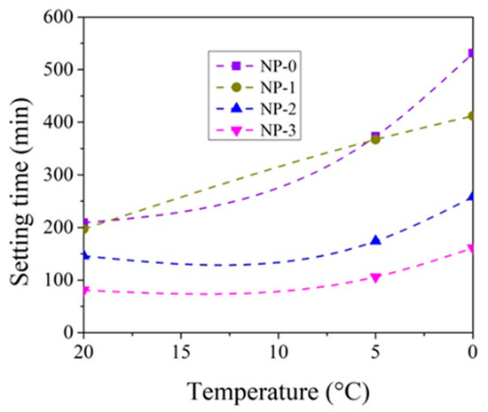 The same tendencies were observed in [45,50], where it is concluded that cement pastes without CN, cured at lower +4 °C temperature, have a lower strength than those cured at higher +20 ± 2 °C.
