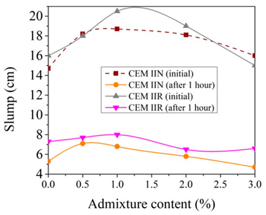Slump of concrete mixtures with CEM IIR and CEM IIN dependence of CN content (0 h—measured instantly after mixing, 1 h—measured after 1 h).