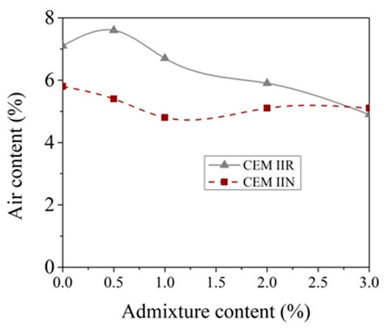 The effect of CN on the entrained air content in concrete is plotted in Figure 8. The tested concrete was mixed with a polycarboxylate ether-based super plasticizing admixture with reduced content of anti-foaming agents. That type of admixture provides required quantity of entrained air content (4–6%) for freezing–thawing resistance concrete without air–entraining admixture. The air content in the concrete produced with CEM IIR decreases from 5.8% to 4.8% when 1% CN is added. Further increasing the CN amount to 3%, the air content remained virtually unchanged at 5.1%. Different effects of CN amount are observed when concrete contains CEM IIN cement. It can be seen in Figure 8 that the control concrete mix entrains 6.6% air and that this is 13.8% more than in the control concrete with CEM IIR cement mix; 0.5% CN slightly increases the amount of entrained air to 7.1%. With further increases in CN, the content air entrained decreases proportionately to 4.4%.