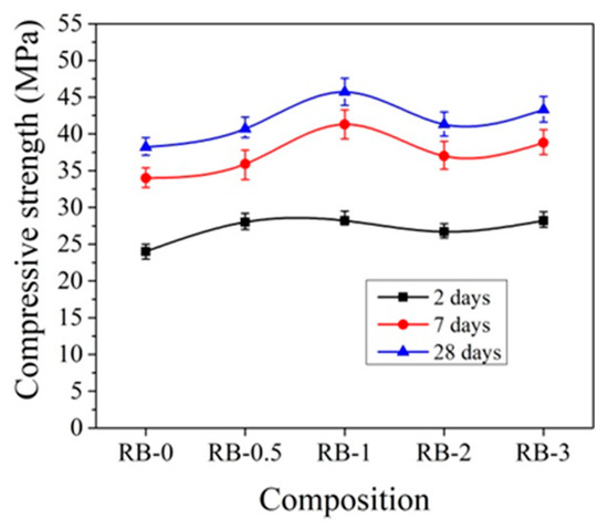 Compressive strength of concrete with CEM IIR samples at −10 °C initial curing (28 days (+20 °C)—reference samples prepared and cured at +20 °C).