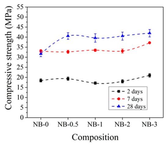 Other trends are observed with the addition of CN with ordinary early strength cement CEM IIN. It can be observed that CN has a smaller effect on the early strength (2 and 7 days) of concrete with CEM IIN (Figure 10). The results reveal that 1% CN alone acts as an accelerating admixture; however, it has only a minor positive impact on the long-term growth of mechanical strength, which is confirmed by Polat [18,47]. The most effective amount in concrete in terms of strength is 3% CN. The compressive strength of concrete increased by 14.1% after 2 days of hardening, by 12.4% after 7 days, and by 32.47% after 28 days compared to control samples. It can be concluded that, at +20 °C for concrete with CEM IIR and for concrete with CEM IIN, 1% and 3% CN, respectively, are most effective. The CN amount (0–4%) efficiency for different cement types CEM I and CEM II/A-LL was tested in research [48]. The samples were cured for 7 days under water and further until testing at +20 °C/65% relative humidity. The compressive strength results after 28 days of hardening show that, for CEM I samples, increasing amounts of CN increased by 12.7% until 4% compressive strength of the samples and that, for CEM II/A-LL samples, compressive strength increased by 22.2%. The same verification of the compressive strength enhancement was identified in [49]. Additionally, it was pointed out that the compressive strength enhancement is related to modification in the porosity of samples.