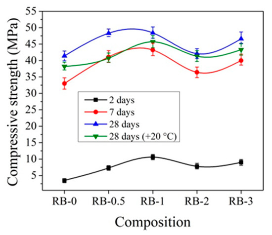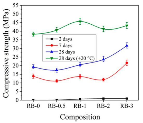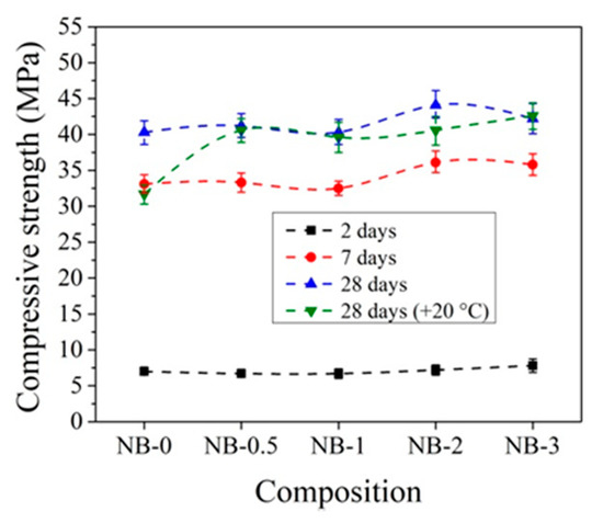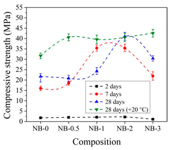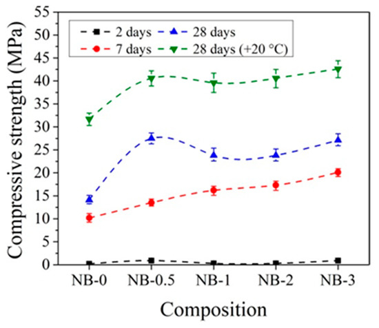 Figure 14 demonstrates that, after 28 days, higher compression strength values are achieved with 0.5–2% CN, but in general, the results obtained are approximately 10% higher in a comparison with samples hardened 28 days at +20 °C.