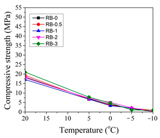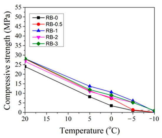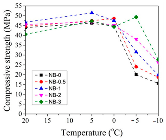 The CN admixture forces the water within the sample to remain at least partially liquid until the temperature falls below the “eutectic point”. It can be supposed that, if curing of samples occurs in temperatures that are near or below the eutectic point of CN degree of hydration drops, the compressive strength of the samples significantly falls due to the formation of ice in pores and it results in microcracks, as is reported in [55]. As it is pointed in the research [19], at low temperatures (−5 °C), particles in the cement paste did not interact or bind with others because particles in the cement paste were moved and separated by ice formed at −5 °C and, as a result, the spaces between particles were not filled by hydrates.