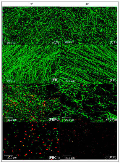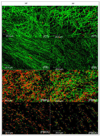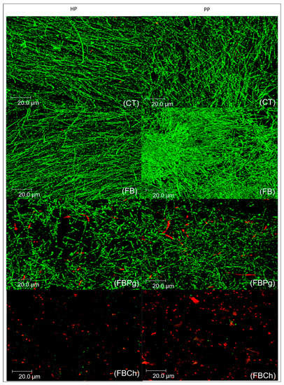 Confocal images of C. albicans biofilms developed on heat-polymerized (HP) and pre-polymerized (PP) surfaces after 48 h of incubation. CT: control; FB: Fibrin biopolymer; FBPg: P. granatum incorporated in fibrin biopolymer; FBCh: Chlorhexidine incorporated in fibrin biopolymer.