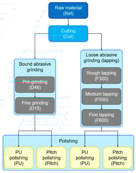The sample material investigated in this work was an optical fused silica glass (Tosoh Corp., Tokyo, Japan, type Clear Silica Glass N). From the raw material, a glass block, four different series of samples were produced by different standard production processes applied in classical optics manufacturing, as shown schematically in Figure 1. The main difference between these series was the approach used for grinding on the one hand and the used polishing pad material on the other hand [1].