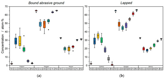 The chemical composition of the investigated sample surfaces after each manufacturing step is shown in Figure 2. Here, merely the glass-forming elements oxygen and silicon as well as the major contaminant of interest, carbon, are considered. It can be seen that the carbon content, which was almost zero in the case of the reference sample, i.e., the fused silica bulk material, rapidly increased due to cutting. After a slight further increase in the course of pre-grinding and rough lapping, the carbon concentration successively decreased and approached or even reached the initially measured reference value. This also applied to the oxygen and silicon content and its ratio, i.e., the nominal stoichiometry of the investigated glass, O/Si = 66%/33% = 2. This value can only be observed after polishing. In the course of cutting, grinding and lapping, the glass surface is thus covered by a carbonaceous layer, which is successively removed by each subsequent manufacturing step.