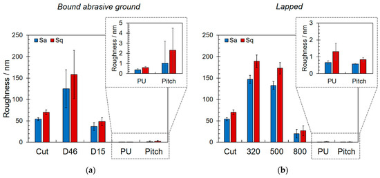 Average area roughness Sa and root mean square area roughness after each manufacturing step for bound abrasive ground (a) and lapped (b) samples. For explanation of the particular sample designations given in the x-axis, see Figure 1.