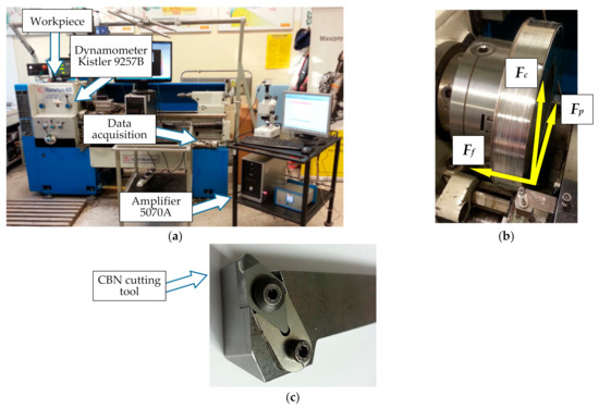 Test bench (a), fastening of the workpiece (b), and cutting tool with cubic boron nitride (CBN) insert (c).