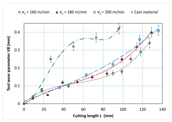 Table 5, Table 6 and Table 7 present selected results of the measurement of the wear of the cutting edge VB, the components of the total cutting force (Fc, Ff, Fp), the and surface roughness parameter Ra, as a function of cutting length L for the cutting parameter values used in the tests (ap = 0.5 mm, f = 0.048 mm/rev).