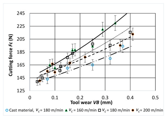 Characteristic of the Fc component of the total cutting force as a function of cutting edge wear VB for: f = 0.048 mm/rev; ap = 0.5 mm.