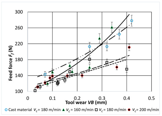 Characteristic of the Ff component of the total cutting force as a function of cutting edge wear VB for: f = 0.048 mm/rev; ap = 0.5 mm.