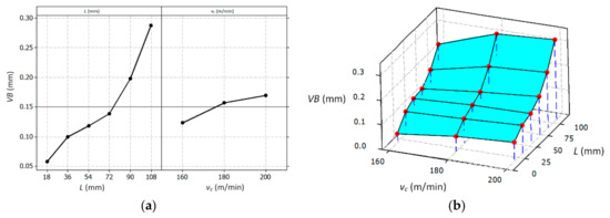 Figure 12 shows the influence of the variables (i.e., cutting length L and cutting speed vc) on the tool wear described by the VB parameter. Likewise, Figure 13 shows the effect of the variables on the cutting force Fc.