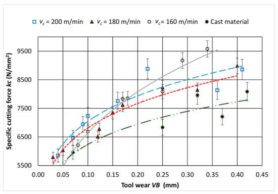 Relationship between the specific cutting force kc as a function of wear of the cutting tool VB.