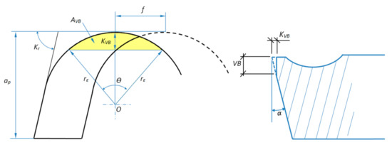 VB wear on the flank surface translates into visible wear on the rake surface KVB (examples are shown in Figure 5 and Figure 6). The KVB value can be calculated approximately based on the Equation (6).