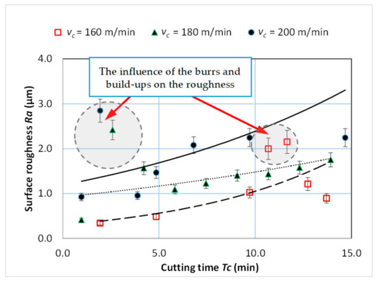Figure 16 shows the curve of the surface roughness Ra as a function of the cutting time Tc and in time of increasing wear of the cutting edge. In the initial phase of the operation (for a new tool) and in the final phase of the cutting tool’s operation (for wear VB > 0.2 mm), a temporary increase in the Ra parameter was observed. These changes may be caused by local deformations on the machined surface. Figure 17 shows the influence of the analyzed variables on the surface roughness Ra values. The results of the statistical analysis showed a significant impact of the cutting length L and the cutting speed vc on the surface roughness Ra values.